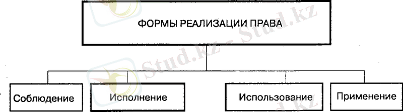 Реализация или осуществление права (претворение его в жизнь) - это родовое, наиболее широкое, собирательное понятие, а соблюде-ние, исполнение, применение, использование и другие формы - ви-довые. Их надо соотносить с общей категорией - “правореализация”.