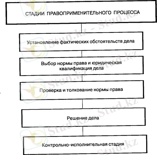 Применение норм права не является простым однозначным дейст-вием. Оно представляет собой достаточно сложный процесс, состоя-щий из ряда логически последовательных стадий. Таких стадий пять (см. схему № 2) . Наиболее четко они прослеживаются при применении норм уголовного права, когда речь идет о преступлениях.