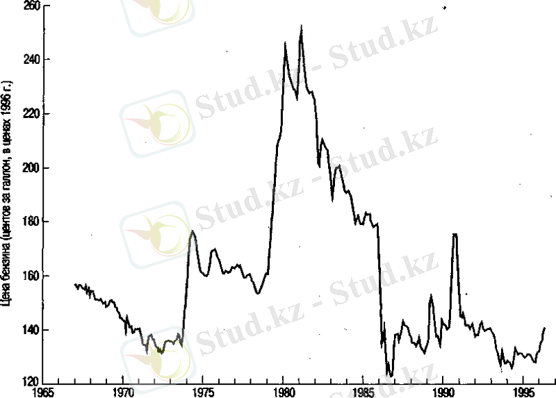 На протяжении последних трех десятилетий цены на бензин были подвержены сильным колебаниям. Относительно небольшой скачок в конце кривой - во время предвыборной президентской кампании 1996 года в США-привел к повсеместным вспышкам спекуляции и вызвал потребность сокращения федерального налога на бензин. Нетрудно понять причины социальной напряженности, спровоцированной беспрецедентным ростом цен на бензин в середине 70-х и начале 80-х годов. Спрос и предложение чрезвычайно важны для понимания этих тенденций. (Источник: Министерства энергетики и труда США. Для перевода текущих цен в цены 1996 г. был использован индекс потребительских цен. )