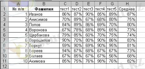 - Выделите диапазоны данных, содержащие фамилии студентов и средние показатели тестирования. В нашем случае это несмежные диапазоны ячеек B1:B11 и H1:H11. Для выделения несмежных диапазонов выделите сначала первый диапазон, затем нажмите на клавиатуре кнопку Ctrl и, удерживая ее, выделите второй из несмежных диапазонов.