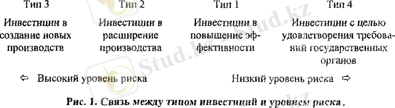 Логика такой зависимости между типом инвестиций и уровнем их риска очевидна: она определяется степенью опасности не угадать возможную реакцию рынка на изменение результатов работы фирмы после завершения инвестиций. Ясно, что с этих позиций организация нового производства, имеющего своей целью выпуск незнакомого рынку продукта, сопряжена с наибольшей степенью неопределенности, тогда как повышение эффективности (снижение затрат) производства уже приня-того рынком товара несет минимальную опасность негативных послед-ствий инвестирования. Аналогичным образом с низким уровнем риска сопряжены и инвестиции с целью удовлетворения требований государ-ственных органов управления.