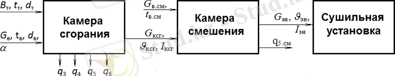 Установка предназначена для получения горячего сушильного агента, представляющего собой смесь продуктов сгорания и воздуха, для группы сушильных установок. Схема процесса горения топлива и последующего разбавления продуктов сгорания воздухом с целью получения энергоносителя в виде смеси горячих газов в заданном количестве G эн и с заданной температурой ϑ эн представлена на рис. 1.