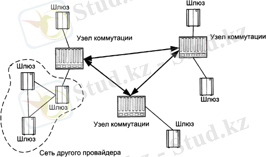 Сеть IP-телефонии представляет собой совокупность оконечного оборудования, каналов связи и узлов коммутации. Сети IP-телефонии строятся по тому же принципу, что и сети Интернет. Однако в отличие от сетей Интернет, к сетям IP-телефонии предъявляются особые требования по обеспечению качества передачи речи. Одним из способов уменьшения времени задержки речевых пакетов в узлах коммутации является сокращение количества узлов коммутации, участвующих в соединении. Поэтому при построении крупных транспортных сетей в первую очередь организуется магистраль, которая обеспечивает транзит трафика между отдельными участками сети, а оконечное оборудование (шлюзы) включается в ближайший узел коммутации (См. рис. 1. 1) . Оптимизация маршрута позволяет улучшить качество предоставляемых услуг. При подключении к сети других операторов их оборудование также подключается к ближайшему узлу коммутации.