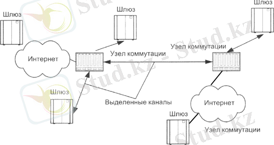 По разным причинам операторы сетей IP-телефонии для объединения своих устройств в сети могут использовать выделенные каналы и сеть Интернет. Такие сети можно назвать сетями смешанного типа (См. рис. 1. 4) . Вопрос о том, какие каналы использовать для связи устройств между собой, решается оператором индивидуально в зависимости от возможностей.