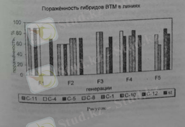 Как видно из рисунка, линии, выделенные из гибридов (июнь), были менее восприимчивы к ВТМ в последующих поколениях F2 - F3. B последующих генерациях F2 и F3 эти линии в начале вегетации поражались в пределах 30-40 %. Относительная динамика устойчивости к местным штаммам у изучаемых линий в последующих генерациях объясняется ежегодным селективным отбором.