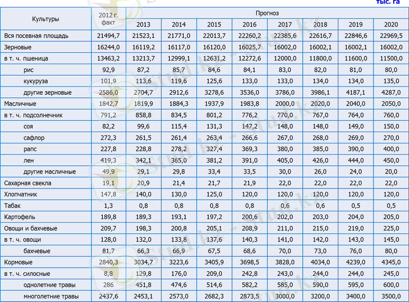 В соответствии с прогнозом посевные площади зерновых культур в целом будет стабилизироваться на уровне 16, 0 млн. га. При этом к 2020 году по сравнению с 2012 годом намечается сокращение посевных площадей пшеницы на 2, 0 млн. га или 14, 2% с одновременным расширением площадей зернофуражных, крупяных и зернобобовых культур (за исключением риса и кукурузы на зерно) до 4, 3 млн. га, что на 1, 7 млн. га или 65, 8% больше уровня 2012 года, соответственно, масличных культур - до 2, 1 млн. га, кормовых культур - до 4, 3 млн. га, овощебахчевых культур и картофеля - до 430, 0 тыс. га. Площади кукурузы на зерно к 2012 году увеличатся на 32, 5%, сои - на 82, 5%, рапса - на 75, 6%, льна - на 7, 3%.