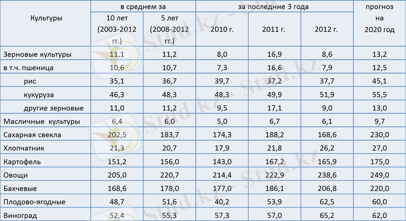 Прогнозная урожайность сельхозкультур и производства продукции на 2013-2020 годы в разрезе областей приведена в приложениях 2 и 3.