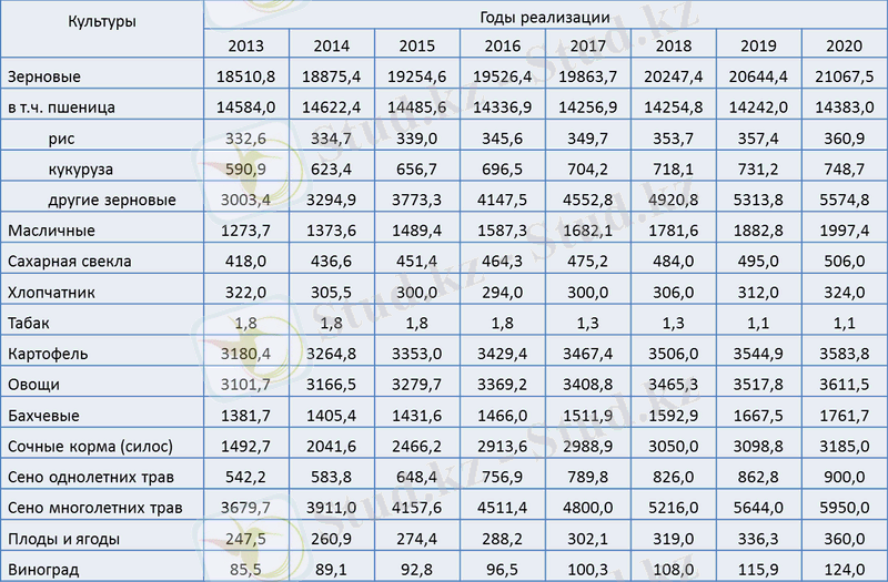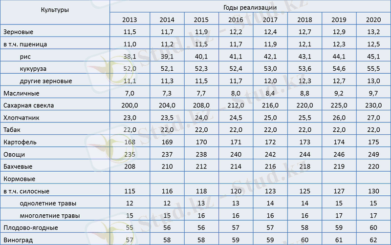 Прогнозная структура посевных площадей сельхозкультур на 2013-2020 годы в разрезе областей приведена в приложении 1.