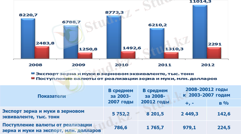 Стабильные урожаи и высокие качественные характеристики казахстанской пшеницы способствовали позиционированию Казахстана в качестве одного из ведущих мировых экспортеров зерна и муки. Казахстан входит в десятку ведущих поставщиков пшеницы на мировой рынок, а по экспорту муки занимает лидирующую позицию в мире. Так, за период 2008-2012 годы среднегодовой объем экспорта зерна с учетом муки в зерновом эквиваленте составил 8, 2 млн. тонн или возрос по сравнению с предыдущим пятилетием на 2, 5 млн. тонн или 42, 6%, совокупная валютная выручка от реализации зерна и муки на экспорт составила более 8, 8 млрд. долларов США с ростом к уровню 2003-2007 годов в 2, 2 раза.