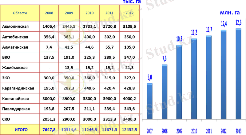 В зоне рискованного земледелия одним из основных способов повышения продуктивности сельскохозяйственных культур является применение технологий. В 2012 году площади применения технологий достигли 12, 4 млн. га, что в 2, 5 раза больше уровня 2007 года, в том числе «нулевых» - 2, 5 млн. га.