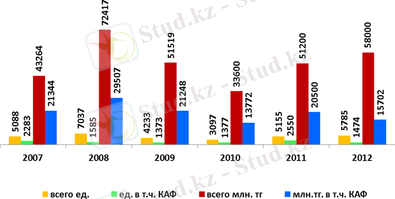 За последние 6 лет (2007-2012 годы) приобретено 30, 4 тыс. единиц сельхозтехники на сумму 310, 0 млрд. тенге, в том числе через АО «КазАгроФинанс» - 10, 6 тыс. единиц на сумму 122, 0 млрд. тенге. В настоящее время у аграриев в наличии имеется более 3, 0 тыс. посевных комплексов, 14, 7 тыс. зерноуборочных комбайнов с соломоизмельчителями и 4, 7 тыс. опрыскивателей, которые используются при применении технологий.
