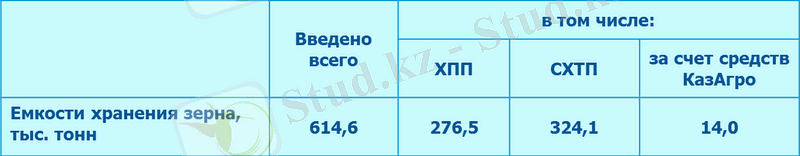 Принимаются меры по развитию инфраструктуры хранения, экспорта и транспортной логистики. Общая емкость хранения зерна составляет 24, 1 млн. тонн, в том числе лицензированных хлебоприемных предприятий - 13, 9 млн. тонн, у - 10, 2 млн. тонн. В 2012 году по республике мощность хранения зерна в целом увеличена на 614, 6 тыс. тонн, в том числе за счет средств КазАгро - на 14, 0 тыс. тонн (у СХТП) .