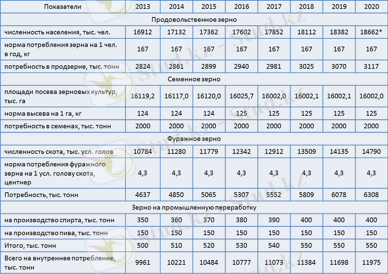 Потребность в зерне внутреннего рынка Казахстана определяется с учетом роста населения и увеличения поголовья скота, а также потребности в семенном зерне и зерне для промышленной переработки (на производство спирта и пива) и составляет к 2020 году около 12, 0 млн. тонн.