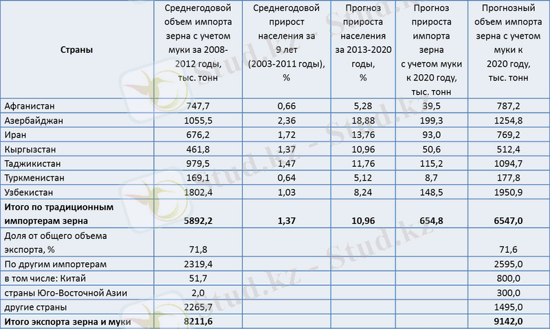 Прогнозный объем импорта казахстанского зерна традиционными импортерами с учетом роста населения к 2020 году составляет 6547, 0 тыс. тонн. С учетом предполагаемого увеличения поставки зерна на китайский рынок (порядка 0, 8 млн. тонн), связанного с быстрым ростом населения в указанной стране, и на емкие рынки стран Юго-Восточной Азии (порядка 0, 3 млн. тонн), а также предполагаемого экспорта зерна по другим странам на уровне 1, 5 млн. тонн, общий объем экспорта зерна с учетом муки к 2020 году составит порядка 9, 1 млн. тонн.
