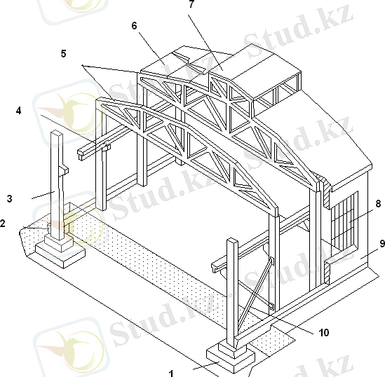 1 - столбчатые фундаменты; 2 - фундаментные балки; 3 - колонны; 4 - подкрановые балки; 5 - фермы; 6 - плиты покрытия; 7 - фонарь; 8 - окно; 9 - стена; 10 - стальные связи