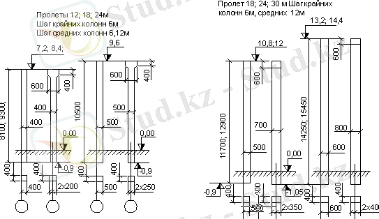 По харарактеру сечения колонны делят на колонны постоянного и переменного сечения (консольные ) . Колонны постоянного сечения предназначены для зданий без крана, с подвесными кранами, имеющих высоту этажа до 9, 6м с пролетами до 24м при шаге колонн 6м.