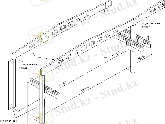 - подстропильные балки перекрывающие шаги колонн и служат опорой для стропильных конструкций.