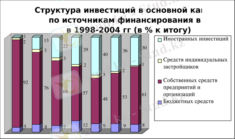 Диаграмма 1 Структура инвестиций в основной капитал по источникам финансирования в РК в 1998-2004 гг.