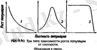Известно три типа зависимости численности популяции от ее плотности (рис. 6) . При первом типе (кривая 1) скорость роста популяции уменьшается по мере увеличения плотности. Это широко распространенное явление позволяет понять, почему популяции некоторых животных относительно устойчивы. Во-первых, при увеличении плотности популяции наблюдается снижение рождаемости. Так, в популяции большой синицы при плотности меньше одной пары на 1 га на одно гнездо приходится 14 птенцов; когда же плотность достигает 18 пар на 1 га, выводок составляет менее 8 птенцов. Во-вторых, при увеличении плотности популяции меняется возраст наступления половой зрелости. Например, африканский слон в зависимости от плотности популяции может достигать половой зрелости в возрасте от 12 до 18 лет. Кроме того, этот вид при низкой плотности дает приплод 1 слоненок за 4 года, тогда как при высокой - рождаемость составляет 1 слоненок за 7 лет.