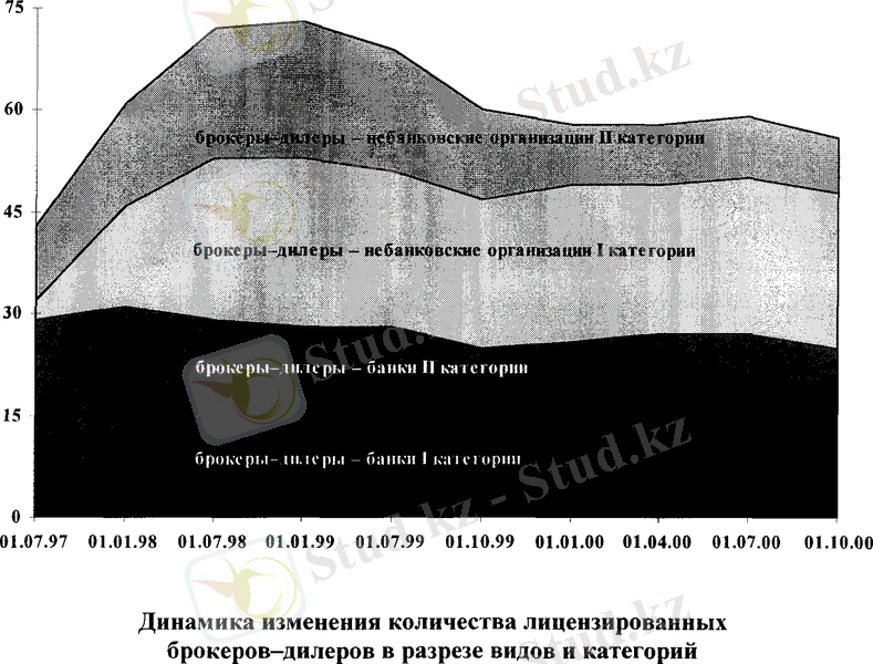 Следует отметить, что численность брокеров-дилеров - банков остается стабильной уже достаточно долгое время. На протяжении периода с середины 1997 года по настоящее время их количество колебалось в пределах 25-31. Устойчивая стабильность количества данных профессиональных посредников фондового рынка является результатом стабильности казахстанского рынка государстенных ценных бумаг, на который они в большей степени ориентированы. Как известно, в силу установленных законодательством ограничительных норм брокеры-дилеры - банки осуществляют деятельность в качестве торговых посредников только на рынке государственных ценных бумаг. Данный сегмент фондового рынка был полностью сформирован еще в 1997 году и продолжает стабильно функционировать до настоящего времени. На биржевом рынке негосударственных облигаций брокеры-дилера - банки участвуют в качестве дилеров.