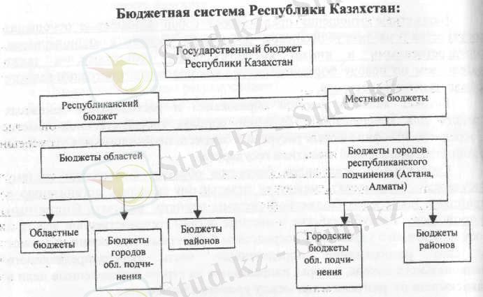 Сегодня бюджетная система Казахстана состоит из республиканского и местных бюджетов (областей, городов республиканского подчинения, городов, районов, районов в городах), смотрите следующий рисунок.