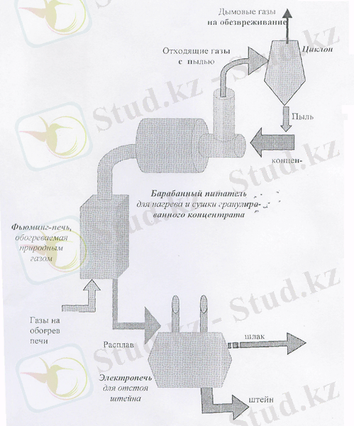 Электродуговая печь предназначалась для отстоя штейна и шлака (добавлялся кремний для повышения текучести шлака) . Сульфидно-мышьяковый концентрат загружался с помощью барабанного питателя гранулированной шихты, через который отсасывались газы с одновременной сушкой гранул. Затем следовала система конденсации мышьяка, сульфида мышьяка из отходящих газов (трубы Вентури, циклоны и др. ) . Компоновка аппаратурной схемы обеспечивает использование наиболее дорогого вида нагрева - электрического - только на последней стадии процесса.