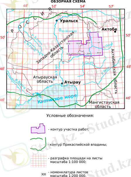 Территория исследований располагается в северной части Прикаспийской впадины, (листы М-39-XXIII, XXIV, XXIX, XXX; М-40-XIII, XIV, XIX, XX, XXV, XXVI; площадь 29 200 км 2 ) в пределах Западно-Казахстанской, Актюбинской и Атырауской областей (Рис. 1) .