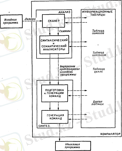 Сначала исходная программа разлагается на ее составные части; затем из них строятся части эквивалентной объектной программы. Для этого на этапе анализа компилятор строит несколько таблиц, которые используются затем как при анализе, так и при синтезе, рис. 1
