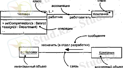 Связью (Link) называется семантическое соединение между объектами. В общем случае связь представляет собой экземпляр ассоциации. Как показано на рисунке, если два класса входят в ассоциацию, то между их экземплярами может наличествовать связь; если же между двумя объектами существует связь, один из них может посылать сообщения другому.