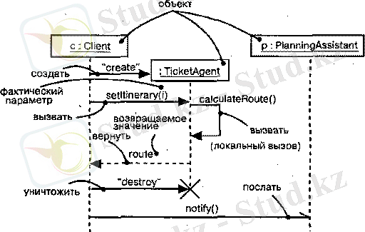 Чаще всего участвующие во взаимодействии объекты существуют на протяжении всего взаимодействия. Но иногда объекты приходится создавать (с помощью сообщения create) и уничтожать (с помощью сообщения destroy) . Сказанное относится и к связям: отношения между объектами могут возникать и исчезать. Чтобы отметить, что объекты или связи появились либо пропали в ходе взаимодействия, к элементу присоединяют одно из следующих ограничений :
