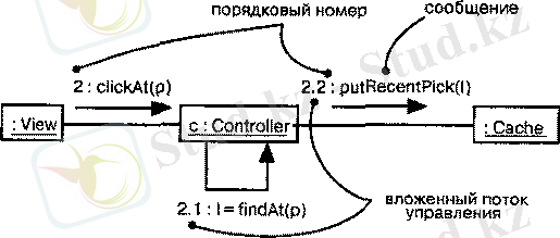 Процедурные и вложенные потоки управления обычно изображают в Виде линий с закрашенными стрелками, как показано на рисунке. В данном случае сообщение findAt является первым из тех, которые вложены во второе сообщение последовательности.