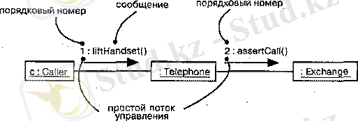 Менее распространенный, но вполне приемлемый способ показан на рисунке Здесь линия с незакрашенной стрелкой представляет простой (неструктурированный) поток управления, который моделирует непроцедурную передачу управления от одного шага к другому. В данном случае сообщение assertCall является вторым в последовательности.
