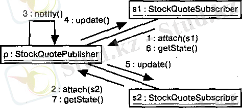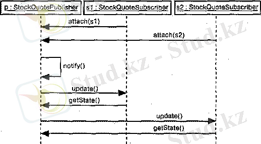 В качестве примера на рисунке показаны объекты, взаимодействующие в контексте механизма публикации и подписки (экземпляр образца проектирования observer) . Вы видите три объекта: р(экземпляр класса StockQuotePublisher), s1и s2(экземпляры класса StockQuoteSubscriber) . Этот рисунок является примером диаграммы последовательностей, описывающей временную упорядоченность сообщений.