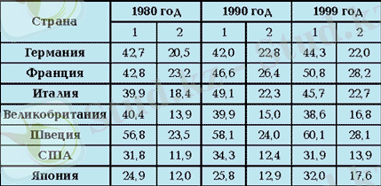 Однако если в области реформирования налоговых систем уже достигнуты определенные успехи, то о сколько-нибудь существенном снижении государственных расходов пока говорить не приходится. В подтверждение сказанного приведу таблицу, отражающую государственные расходы (графа 1) и социальные трансферты (графа 2), то есть расходы на социальное обеспечение, помощь безработным, пенсии, здравоохранение (кроме образования) в процентах к ВВП.
