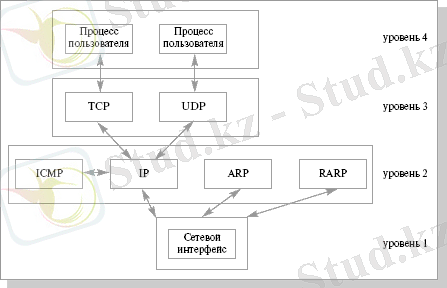 На каждом уровне семейства TCP/IP присутствует несколько протоколов. Связь между наиболее употребительными протоколами и их принадлежность уровням изображены на рисунке 2