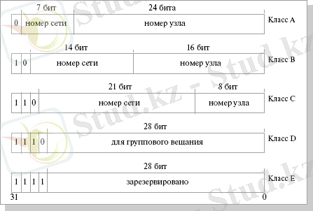 Все IP-адреса версии 4 принято делить на 5 классов. Принадлежность адреса к некоторому классу определяют по количеству последовательных 1 в старших битах адреса (см. рис. 3) . Адреса классов A, B и C используют собственно для адресации сетевых интерфейсов. Адреса класса D применяются для групповой рассылки информации (multicast addresses) и далее нас интересовать не будут. Класс E (про который во многих книгах по сетям забывают) был зарезервирован для будущих расширений.