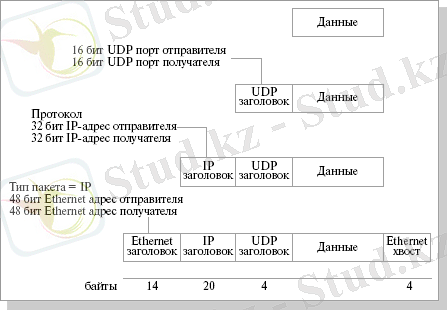 Добавление необходимой информации к данным при переходе от верхних уровней семейства протоколов к нижним принято называть английским словом encapsulation (дословно: герметизация) . На рисунке 5 приведена схема encapsulation при использовании протокола UDP на сети Ethernet.