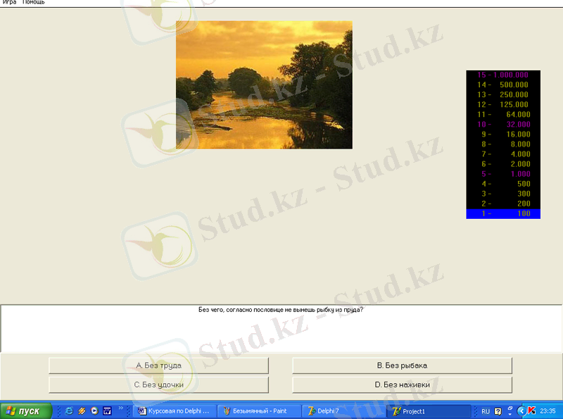 Разработать игровую программу «О! Счастливчик!», которая включает игровую панель. Игрок должен зарегистрироваться, затем начать новую игру. Необходимо отвечать на вопросы, нажимая на ответ, который кажется игроку верным. Существуют «подсказки», типа: «помощь зала», «звонок другу», «50\50». При выборе правильного ответа на счет игрока «начисляются» деньги. Существует несгораемая сумма, которая даже при выборе неправильного ответа не уничтожается. Победа присуждается игроку, т. е. 1 тг, правильно ответившему на все 15 вопросов.