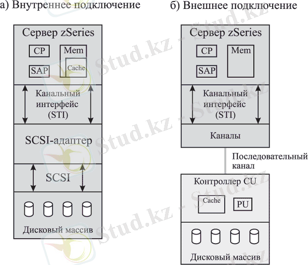 Прямое подключение предполагает использование отдельной памяти для каждого сервера. Возможны варианты с размещением памяти в одном корпусе с центральными устройствами или в виде отдельного устройства, подключаемого через предусмотренные в сервере интерфейсы. Внутреннее подключение памяти (рис. 2а) реализуется путем соединения памяти через адаптер напрямую с канальным интерфейсом (STI) . Вариант такого подключения через интерфейс SCSI-адаптер приведен на (рис. 2а) . Этот вариант не предусматривает использование каналов и канальных программ, а cache дисков и управляющая информация, связанная с обменами, размещается в системной HSA-памяти сервера.