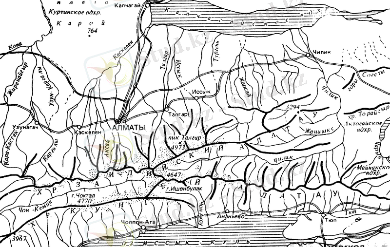 Южнее Алматы возвышаются северные отроги горной системы, которая делится здесь на два водораздельных хребта - Заилийский Алатау (названный так первыми переселенцами, двигавшимися с севера, для которых он являлся первым хребтом за рекой Или) и Кунгей-Алатау (“пестрые снежные горы, обращенные к солнцу”) . Естественной границей этого горного района с юга является озеро Иссык-Куль.