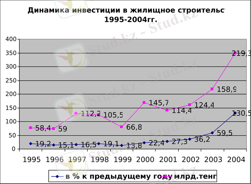 В указанный период объемы инвестиций составляли 16, 7 млрд. тенге в среднем за год. Однако начиная с 2000 года в Казахстане наблюдается заметный прирост вложений в жилищное строительство.