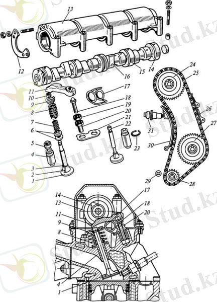 Привод распределительного вала осуществляется через установленную на нем ведомую звездочку 24 двухрядной роликовой цепью 25 от ведущей звездочки 28 коленчатого вала. Этой цепью также вращается звездочка 27 вала привода масляного насоса. Привод распределительного вала имеет полуавтоматический натяжной механизм, состоящий из башмака и натяжного устройства. Цепь натягивается башмаком 30, на который воздействуют пружины натяжного устройства 31. Для гашения колебаний ведущей ветви цепи служит успокоитель 26. Башмак и успокоитель имеют стальной каркас с привулканизированным слоем резины. Ограничительный палец 29 предотвращает спадание цепи при снятии на автомобиле ведомой звездочки распределительного вала.