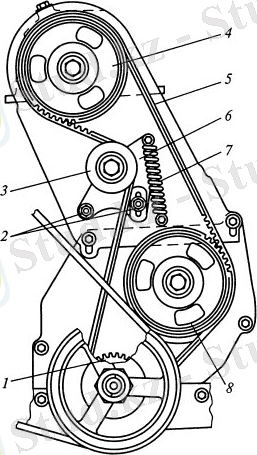Особенностью привода распределительного вала (рис. 3) является применение ременной передачи. Привод распределительного вала осуществляется через установленный на нем зубчатый шкив 4 ремнем 5 от зубчатого шкива 1 коленчатого вала. С помощью этого ремня также вращается зубчатый шкив 8 вала привода масляного насоса.