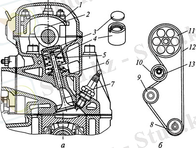 Рис. 4 Газораспределительный механизм (а) с верхним расположением распределительного вала и его привод (б)