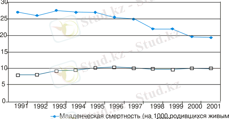 Показатель младенческой смертности очень важен для Казахстана и отражает в целом ситуацию в политике сохранения и укрепления здоровья детей. Как видно из рисунка 2, максимальный уровень младенческой смертности отмечался в 1993 г., затем этот показатель имел тенденцию к снижению, и в 2003 г. он составил 19, 4 на 1000 младенцев, родившихся живыми.