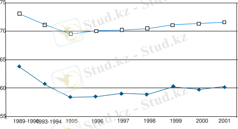 На рисунке 3 отражено, что в Республике Казахстан происходит снижение этого показателя как у мужчин, так у женщин и при этом разрыв в средней ожидаемой продолжительности жизни между ними достигает в среднем 11 лет. В экономически развитых странах Европейского региона Всемирной Организации Здравоохранения (ВОЗ) средняя ожидаемая продолжительность жизни составила: в Соединенном Королевстве - 77, 6 лет (75, 1 лет у мужчин и 80 лет у женщин), во Франции - 78, 9 лет (75 у мужчин и 82, 7 лет у женщин), в Швеции - 79, 6 лет (77 у мужчин и 82, 2 г. у женщин), в Германии - 78, 1 лет (74, 9 лет у мужчин и 81 г. у женщин) .