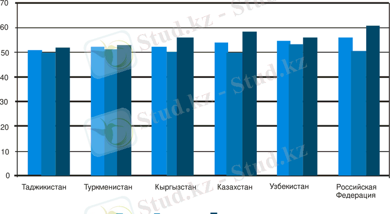 Рисунок 4 показывает, что для некоторых стран СНГ, при ОПЗЖ на уровне 50 лет, ее показатель варьирует в диапазоне от 49, 6 до 60, 6 лет - в какой-то мере эти различия служат отражением особенностей, обусловленных влиянием политики укрепления здоровья и проведения профилактических мероприятий, а также уровнем качества работы систем здравоохранения в целом.