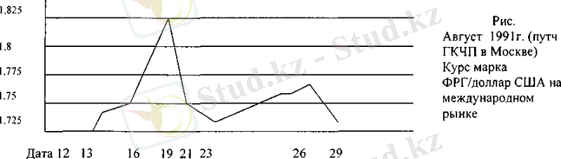 В августе 1991г. во время путча в бывшей СССР немецкая марка моментально обесценилась на 4 % в течение 3 дней против доллара США (рис. 4) как валюта страны, имеющей тесные экономические, территориальные ч политические связи с кризисной страной