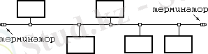 Все компьютеры подключаются к одному кабелю (шине данных) . На концах кабеля устанавливаются терминаторы . Их наличие для сетей Ethernet обязательно. По такой топологии строятся 10 Мегабитные сети 10Base-2 и 10Base-5. В качестве кабеля используется коаксиальный кабель. Повреждение общего кабеля или любого из двух терминаторов приводит к выходу из строя участка сети между этими терминаторами (сегмента сети) . Отключение любого из подключенных устройств на работу сети никакого влияния не оказывает.