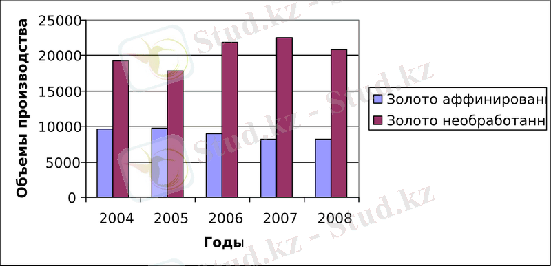 Из рисунка 1 следует, что в период с 2004 по 2008 года объемы производства необработанного золота почти в два раза превышает аффинированное золото.